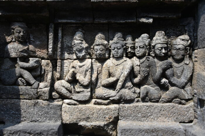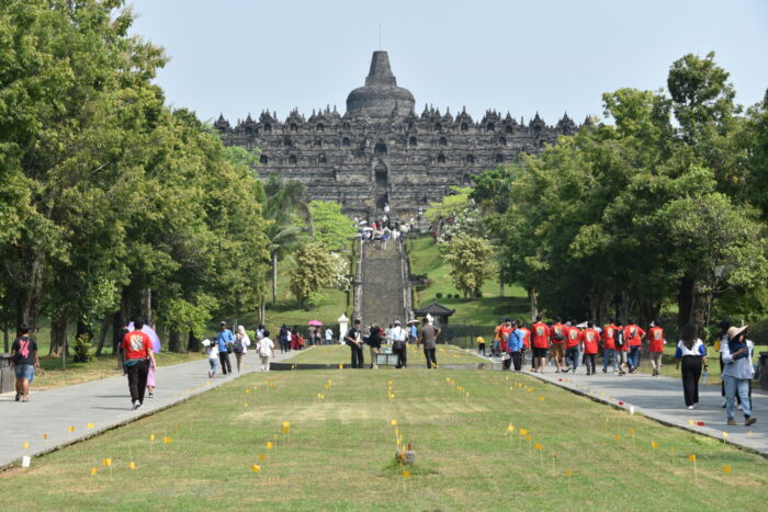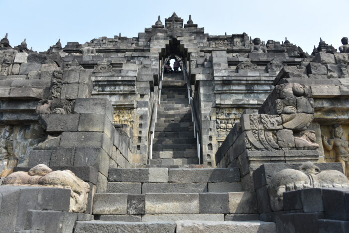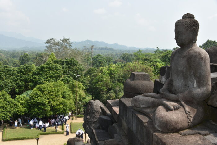Borobudur je největším buddhistickým chrámem na světě. Byl postaven v 9. století a má strukturu mohutné mandaly, která v buddhismu symbolizuje vesmír. Na jeho stavbu byly použity přibližně dva miliony kamenných kvádrů a skládá se z devíti na sebe položených plošin zakončených centrální kopulí. Celou stavbu zdobí 2 672 reliéfních desek zobrazujících výjevy z Buddhova života. V horním patře Borobuduru se nachází 72 malých stúp se sochami Buddhy, obklopujících velkou centrální stúpu. Chrám je v původním stavu, pouze některé kameny byly částečně zrekonstruovány, žádná část poničeného materiálu však nebyla nahrazena novým. Na některých stúpách proto chybí ukradené nebo zemětřesením poničené části soch. Chrám symbolizuje cestu k osvícení – každá úroveň představuje jiný stupeň duchovního vývoje od světského k božskému.
