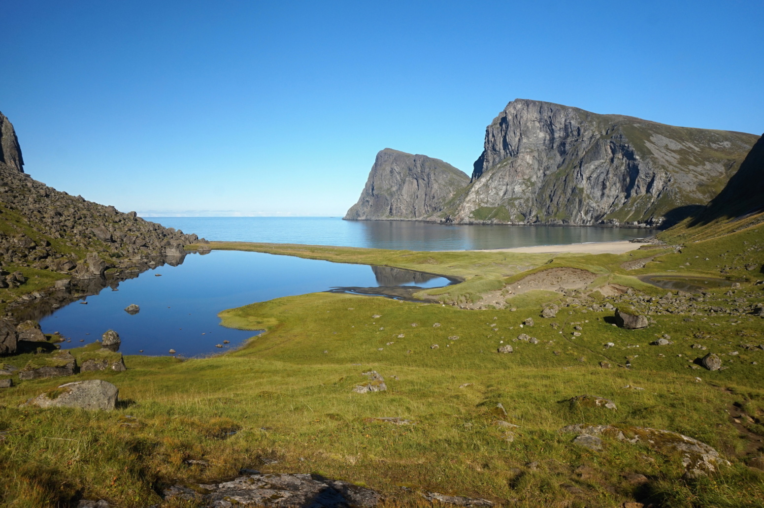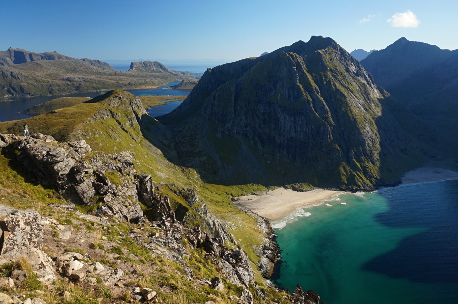 Vydáme se na další známou pláž Uttakliev, odkud budeme pokračovat na vyhlídkový vrchol Himmeltindan neboli Nebeský vrchol.